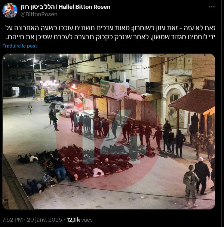 On January 20, 2025, during the night, dozens (~65) of Palestinians were detained by Israeli soldiers in Azzun, Qalqilya Governorate, occupied West Bank. Footage shows dozens of detained Palestinians, most of them lying down next to Israeli soldiers, close to the Azzun Grand Mosque.