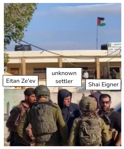 One of the settlers carrying out the school invasion is Eitan Ze'ev, who is known his activity in the violent outpost "Sde Efrayim", between Kufer Na'ame and Ras Karkar, and on their lands. Over there, 4 years ago, he killed Khaled Nofel, a 34 year old Palestinian, husband and father. Ze'ev was never charged for the killing for claims of "self defence", but Khaled wasn't armed, and was a day before he was suppose to reunite with his wife and child after a long atay in Jordan. Ze'ev is also one of the founders of Havat Dorot outpost on the lands of Bidya. Over there, on July 2020, Ze'ev shot a Palestinian farmer trying to access his lands. He was brought to court and convicted, but never went to prison.