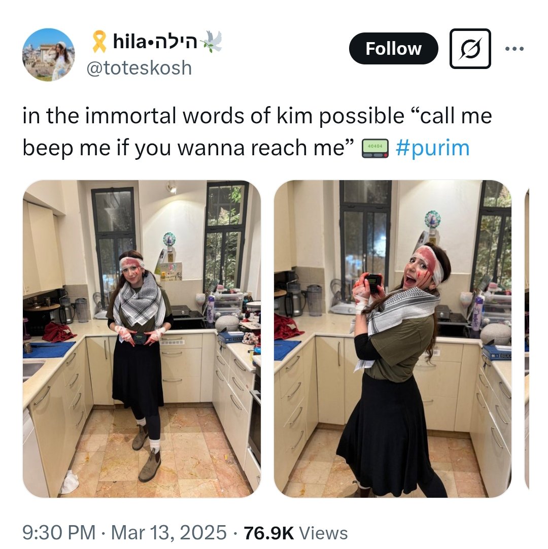 As a lot of Israeli, even children, Israeli singer Hila Oz posts portraits of herself in a Purim costume mocking Israel's victims, with a pager, keffiyeh, and fake wounds.