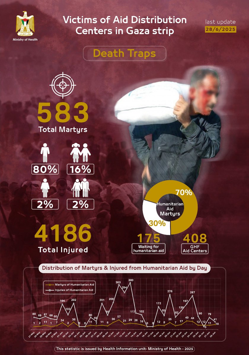 The Ministry of Health updated the death toll from what it called the "aid death traps" to 583 killed, including 408 specifically at GHF sites, and 175 killed while waiting for aid entry.