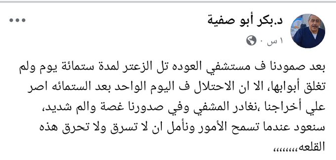 Al-Awda was the last hospital relatively operating in the North Gaza governorate after Israel had destroyed Kamal Adwan Hospital and besieged and shelled the Indonesian Hospital, forcing the latter's evacuation.