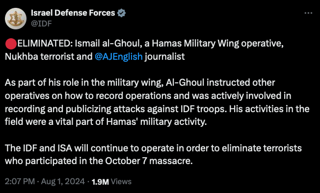 The next day the IDF officially boasted about the assassination, falsely labeling Ismail as a Nukhba operative in Hamas who "instructed other operatives on how to record operations and was actively involved in recording and publicizing attacks against IDF troops."