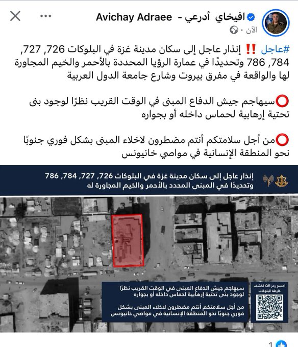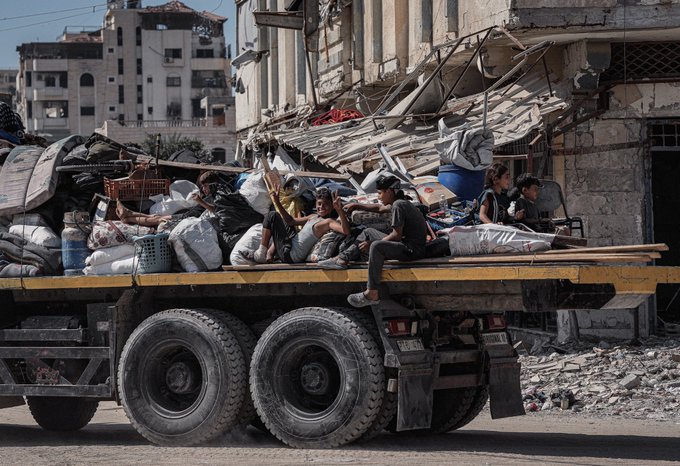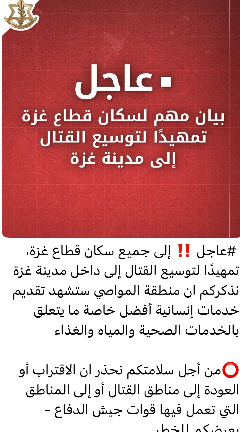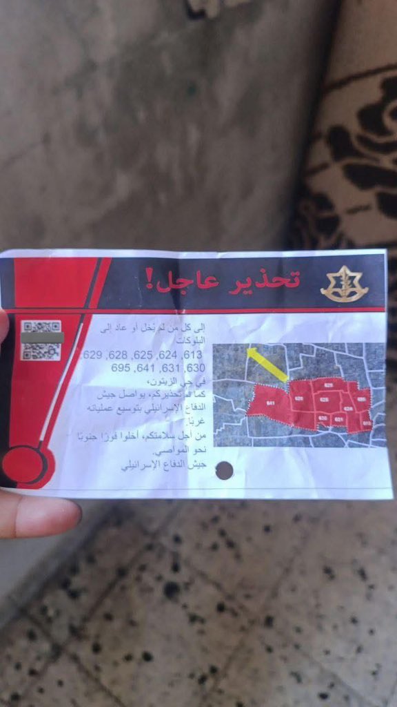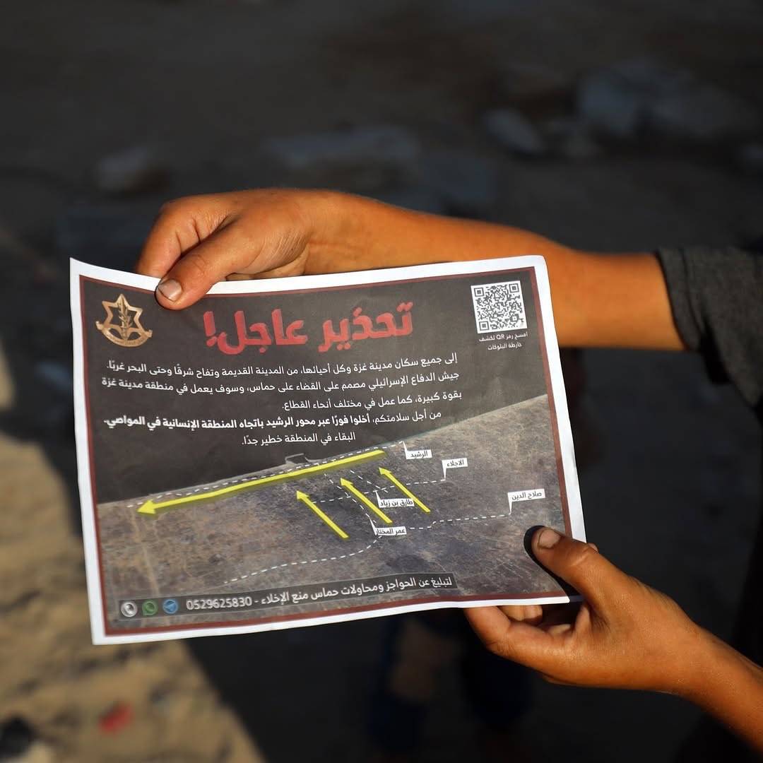 The IDF dropped leaflets and officially announced on social media forced displacement orders for all people in Gaza City to move south to Al-Mawasi, describing it as a "humanitarian zone".