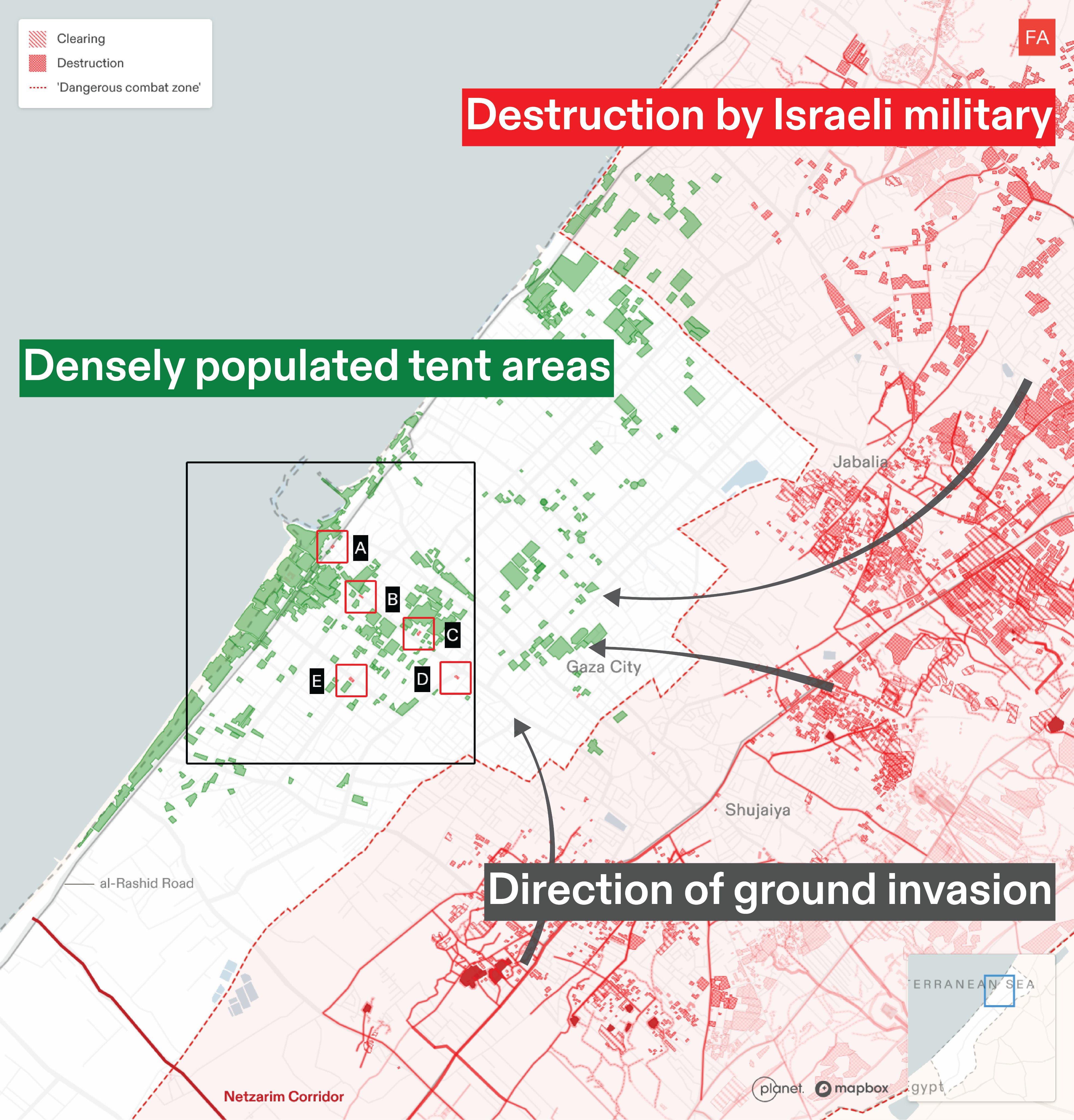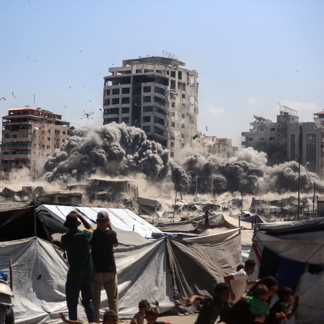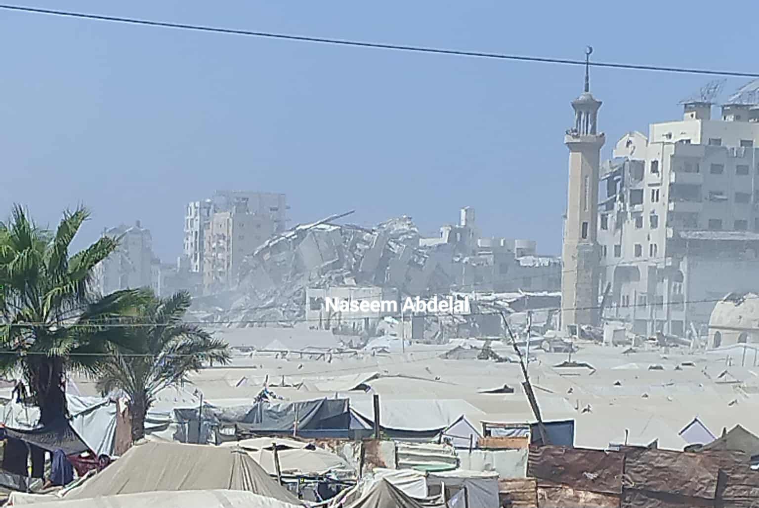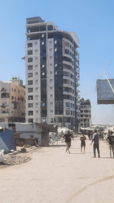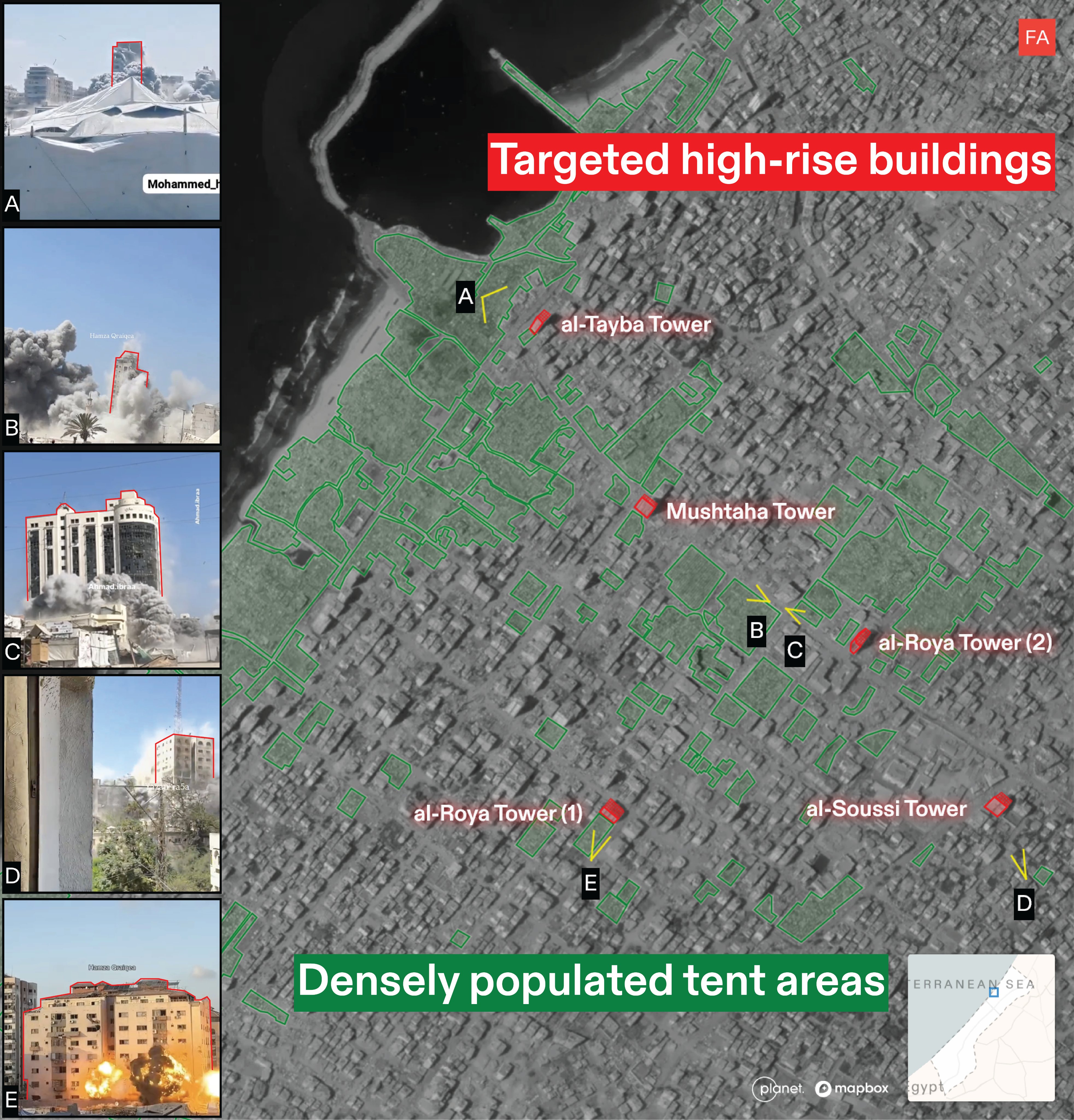 Most of these high-rise buildings were surrounded by displacement camps and thus densely populated. Israel's airstrikes destroyed not only the buildings themselves, but tents and the small communities that had formed there, exacerbating conditions to push the displaced populatyion to be further displaced.