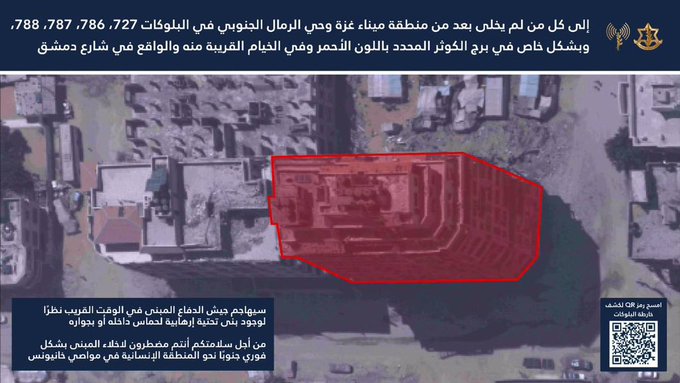 Moments later, the IDF order the evacuation of the Roya and Al-Sousi Tower residential buildings. The latter was previously bombed and was surrounded by a large number of tents for displaced families.