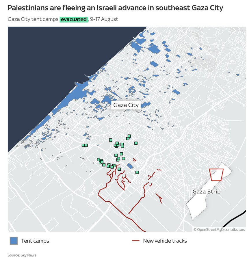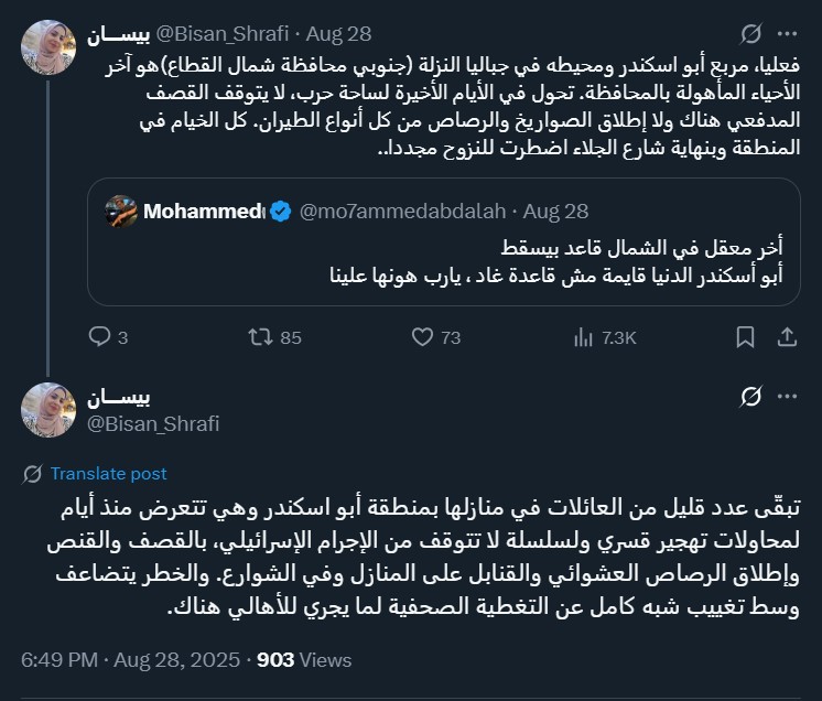 By the end of August, most of the areas at the northern edge of Gaza City (Jabalia al-Nazla, Jabalia al-Balad, Saftawi, Abu Iskandar) were ethnically cleansed due to the constant shelling and drone terror. Locals reported that the assault was relentless that people were killed and maimed even during their displacement, as evidenced by footage.