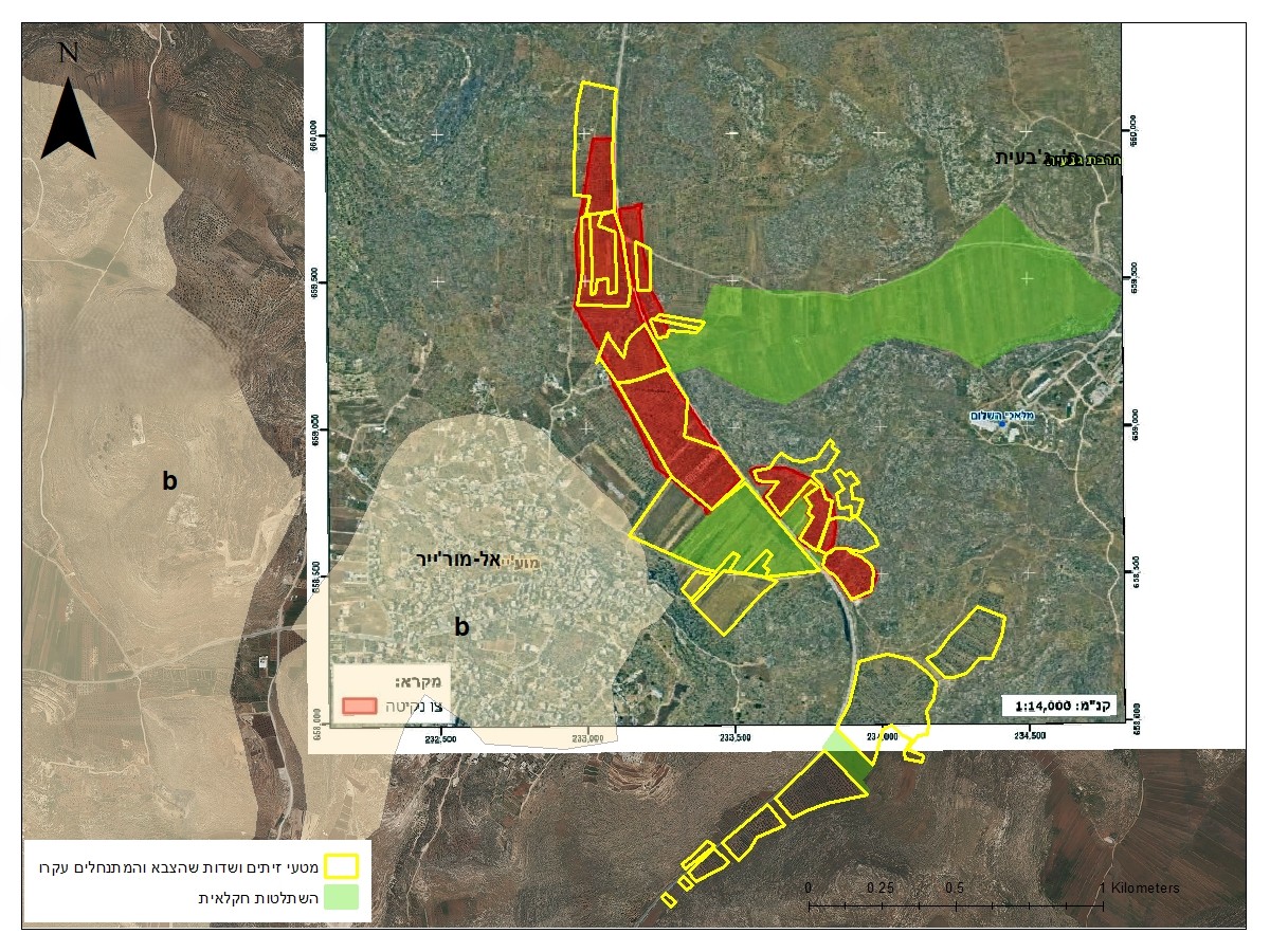 "In practice, the work was carried out jointly by the army and local settlers who own heavy machinery. The uprooting operations lasted for several days. Following mapping we conducted on the ground, we can now say that the actual area where the army and settlers uprooted trees stands at about 620 dunams — more than double the area included in the order. In addition, settlers have begun — and continue — to carve an entirely new road, with the aim of seizing thousands of dunams between al-Mughayyir and the extremely violent outposts east of the Shiloh settlement. We assume that along this illegal road, settlers will soon establish yet another outpost, whose purpose will be to further tighten the noose around the village of al-Mughayyir. Work at the site has been ongoing for over a week and a half, leaving no doubt that Apartheid General Bluth and his subordinate, Col. ‘Anan Fares - recently appointed commander of the Binyamin Brigade, under whose responsibility this area falls both were, and remain, fully aware of what is happening on the ground: settlers, under army protection, are uprooting olive trees on hundreds of dunams not covered by the military order."