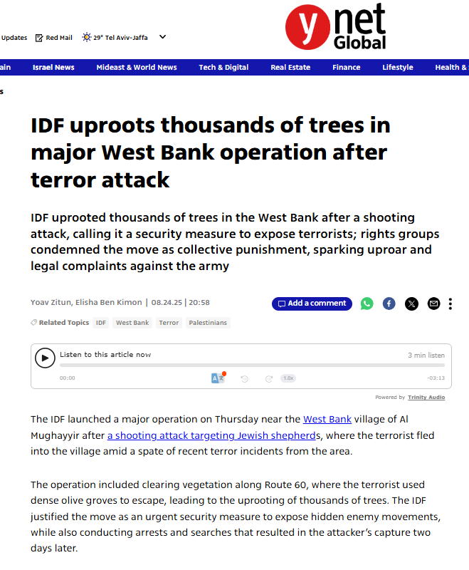 Yesh Din and ACRI demanded a criminal investigation of Maj. Gen. Yehuda Fuchs Bluth for alleged war crimes and collective punishment.They cited international law violations and the lack of appeal rights for residents. The IDF spokesperson defended Bluth, calling criticism “inappropriate” and insisting actions were lawful. However, uprooting entire groves deepened suspicions of collective punishment. MK Zvi Sukkot (Religious Zionism) praised the uprooting: “Finally the IDF is acting as it should.” Elisha Yered, settler activist, openly framed the actions as collective punishment and urged wider use across villages.