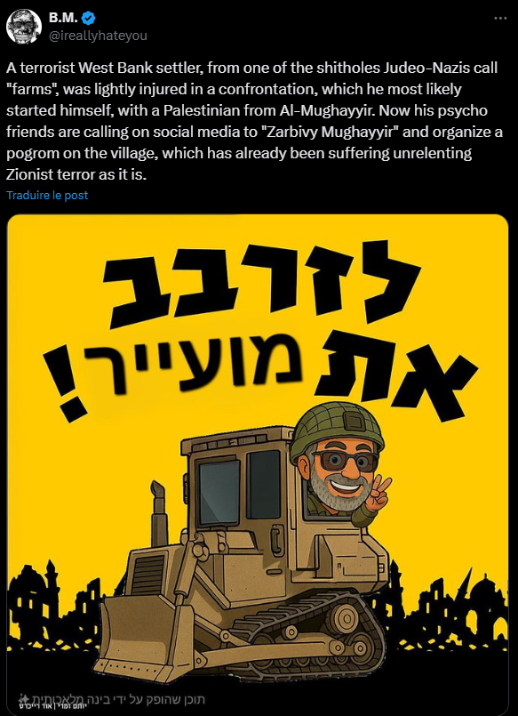 Settlers spread around the village from 8:30 a.m., inciting violence online and circulating threats, including a leaflet with a bulldozer calling to demolish the village. According to B.M., the Israeli friends are calling on social media to "Zarbivy Mughayyir" and organize a pogrom on the village, which has already been suffering unrelenting Zionist terror as it is. They uprooted thousands of olive trees, vandalized Palestinian cars, and continued land destruction during the day.