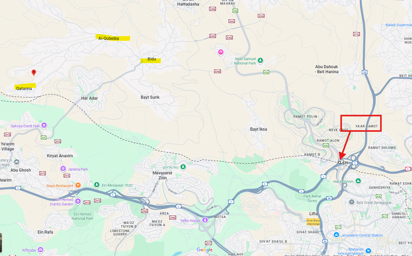 The "Ramot" settlement junction is built on the lands of village of Nabi Samwil, Beit Iksa and Shuafat in the northern occupied Jerusalem. The Geolocation of the assault is 31.808312, 35.204016, a few meters from the green line but inside the West Bank.