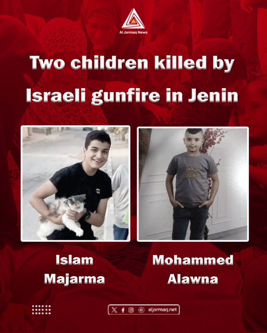 "Islam Abdulaziz Nouh Majarmah and Mohammad Seri Omar Masqala, both 14 years old, were shot and killed by Israeli forces in separate but related incidents in the early evening of September 8 outside of Jenin refugee camp in the northern occupied West Bank, according to documentation collected by Defense for Children International - Palestine. Both boys were killed near Jenin Governmental Hospital, close to the entrance of Jenin refugee camp, which has been under Israeli military siege since January 21, 2025, during which Israeli forces have forcibly displaced all residents of the camp.
