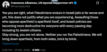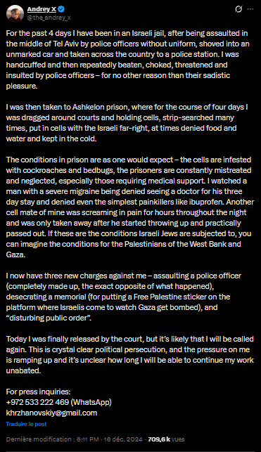 On December 16, 2024, Andrey published a long tweet about his exprience in jail and the abuses that were committed on him. “This is crystal clear political persecution,” Andrey said, adding that jail was devastating not only because of physical abuse, but because of “the sense of your humanity being stripped from you, and the complete loss of agency and autonomy. The Sepcial UN Rapporteur oPt Franceska Albanese commented : "Yes you are right, what Palestinians endure in Israeli jails is far worse and yet, this does not justify what you are experiencing. Assaulting those who oppose apartheid is apartheid itself, and Israeli policies are becoming more destructive for everyone with every passing day: including its Jewish citizens. Stay strong, you are not alone. Neither you nor the Palestinians. We will bring down apartheid, from both sides, brick by brick."