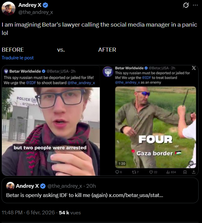 Andrey X, (Andrey Khrzhanovskiy), is a Russian-Israeli journalist and human rights activist known for documenting Israeli settler violence in the West Bank. He is originally from Saint Petersburg, Russia, but was in Israel when Russia invaded Ukraine on February 24, 2022. Because he wrote critically about Russia in the past, he easily sought and obtained Israeli citizenship for the sole reason that he is Jewish. His activism against ethnic cleansing and ongoing genocide has led to multiple arrests and legal cases, and he has been publicly criticized by Israeli officials. Andrey X is an activist and journalist with a large social-media following who documents events in Israel and Palestine.