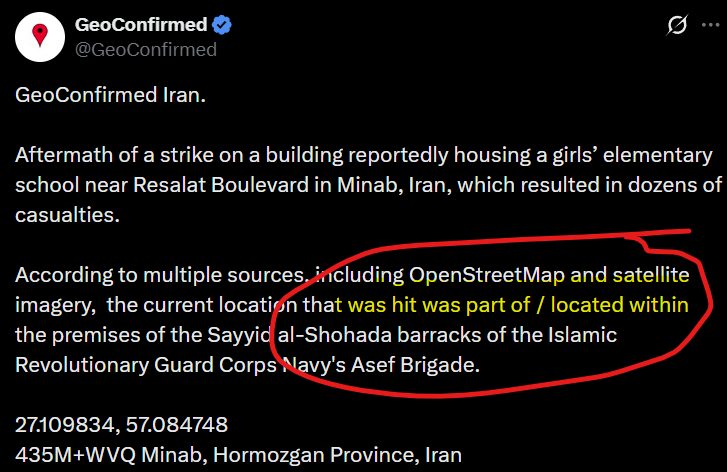 Some pro-Israeli accounts claimed the site was part of an IRGC military base, but critical contradiction highlighted that the missiles hit the military base, and the school, but avoided a civilian clinic located between them that opened in 2025. This suggests attackers had accurate, updated targeting information, raising questions about Serious intelligence failure, or deliberate targeting of the school.