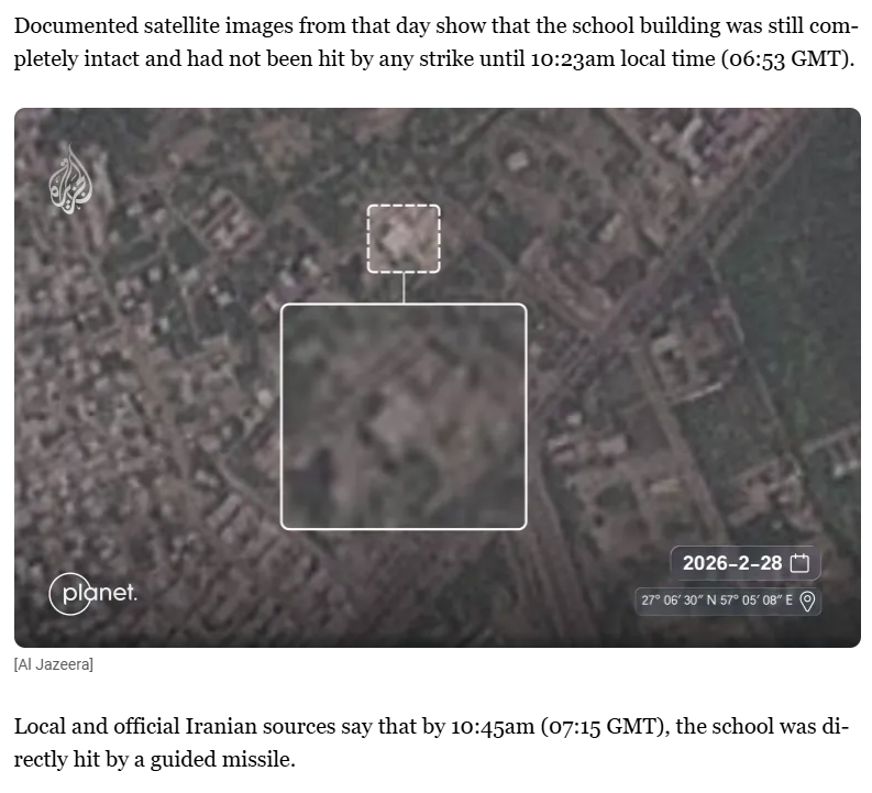 On March 4, a Middle East Eye investigation on the ground, gathering the testimonies of the victims conclued that The girls’ school in Iran, where 165 people were killed by an apparent US-Israeli attack, was hit with two strikes, with the second missile killing sheltering survivors, two first responders and the parent of a slain child have told Middle East Eye. “When the first bomb hit the school, one of the teachers and the principal moved a group of students to the prayer hall to protect them,” one of the Red Crescent medics said, citing conversations he had at the time with survivors. “The principal called the parents and told them to come and pick up their children. But the second bomb hit that area as well. Only a small number of those who had taken shelter survived.”