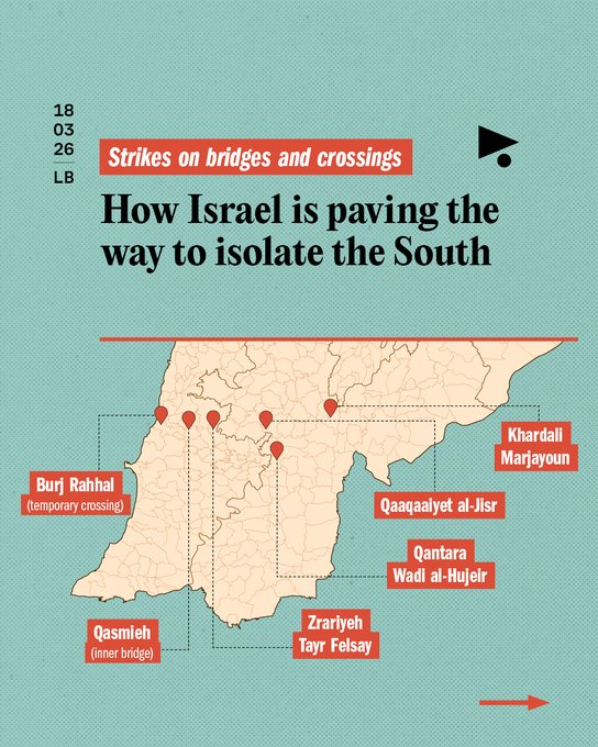 During the third week of March 2026, Israeli forces began implementing a plan to isolate the South of Lebanon, separating areas south of the Litani River from those to the north by targeting several key bridges: Deir Mimas–Marjayoun, Khardali–Marjayoun, Tayr Felsay–Zrariyeh, and the Wadi al-Hujeir–Qantara bridge.
