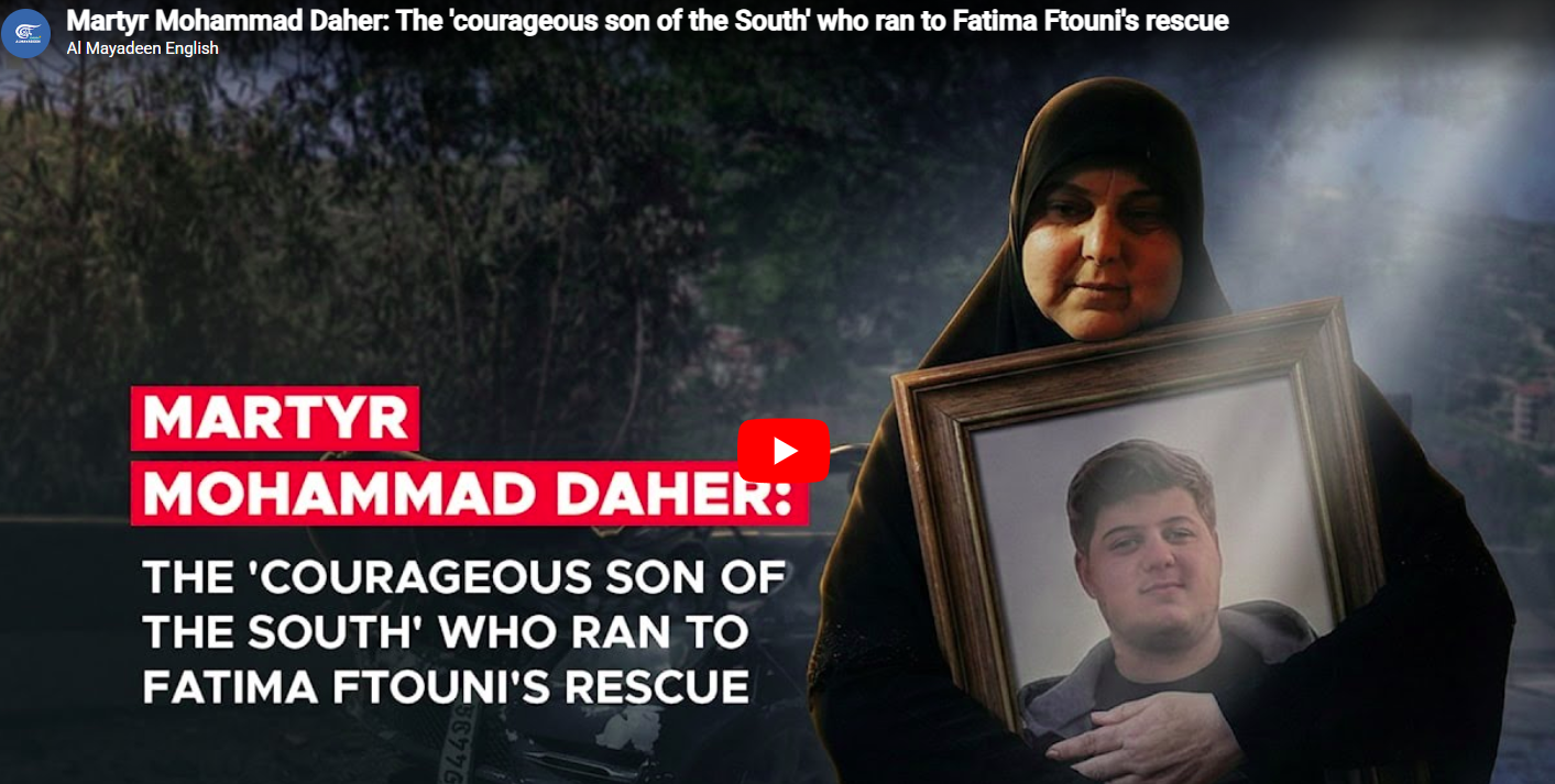 Mohammad Daher’s mother recalled her son's true act of heroism with pride and heartbreak in an interview for Al Mayadeen. At just 17, he happened to be passing by, along with his friend Ahmad Oneissi, when he saw journalist Fatima Ftouni heading his way after she survived the first strike. He rushed to help her, ignoring the Israeli aircraft overhead. Yet, Israeli treachery was faster, and the second missile struck, killing them all. "He was fearless, gentle, always ready to help, and loved by everyone," his mother recounted. His mother said that Mohammad embodied the spirit of the people of the South: brave, selfless, and devoted to protecting his people and land.