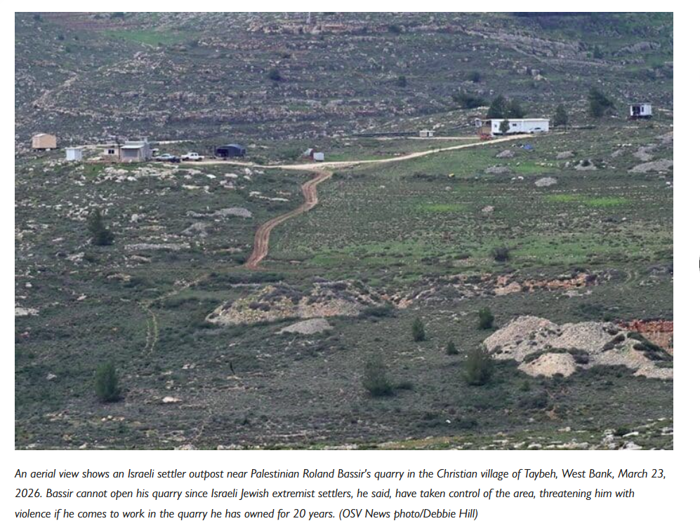 On the morning of March 19, 2026, more than 30 Israeli settlers entered a privately owned stone quarry and cement factory on the outskirts of Taybeh — a small Palestinian town of roughly 1,200 to 1,500 people nestled in the West Bank hills north of Jerusalem. They performed religious rituals on the grounds, pitched tents, posted guards to prevent workers from accessing the site, and hoisted an Israeli flag atop one of the plant’s storage tanks,and warned the Christian community that anyone returning would be killed.
